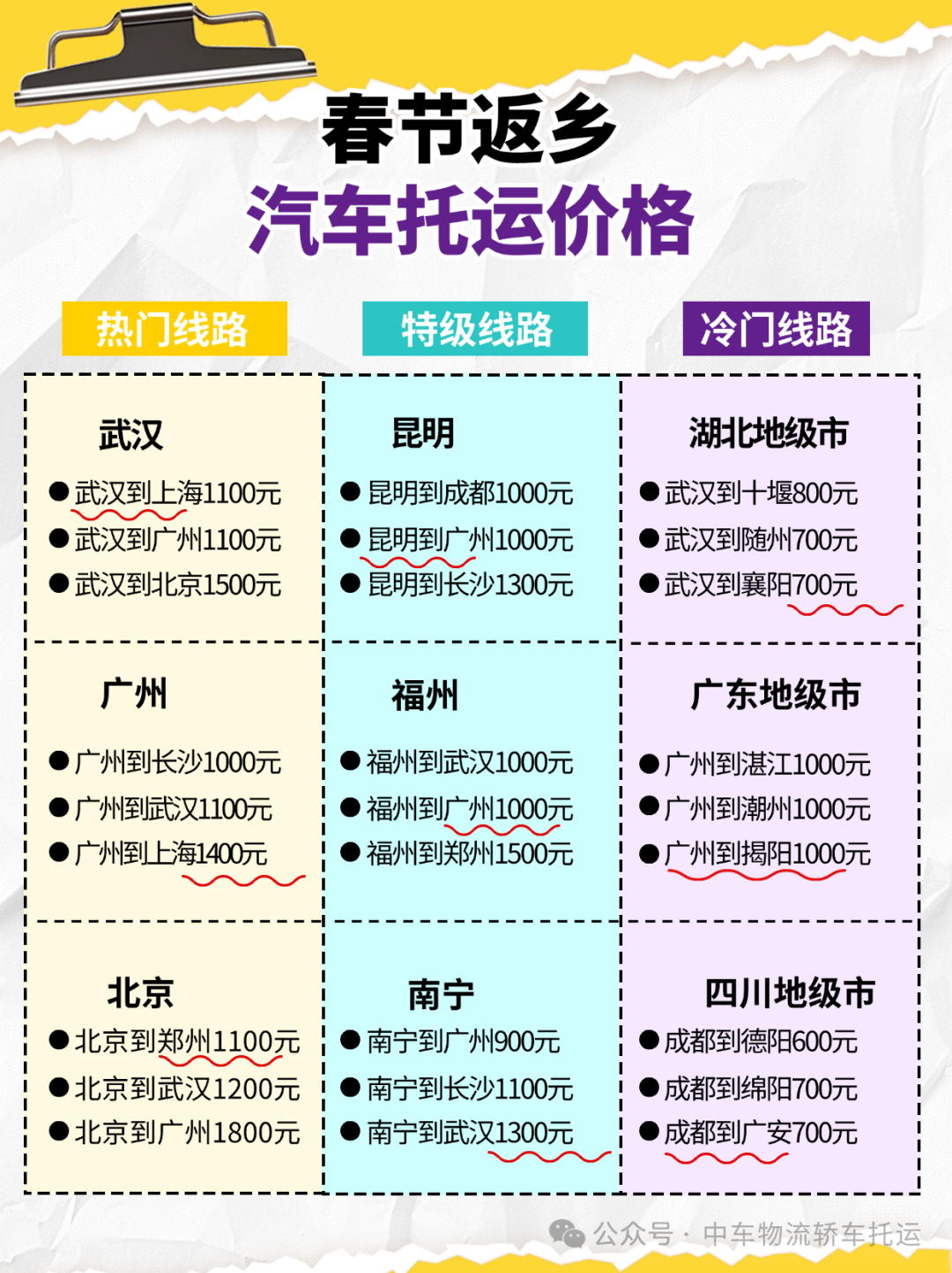 为了帮助车主们更好地了解当前托运市场的价格情况,以下是部分热门、特价及冷门线路的托运价格: