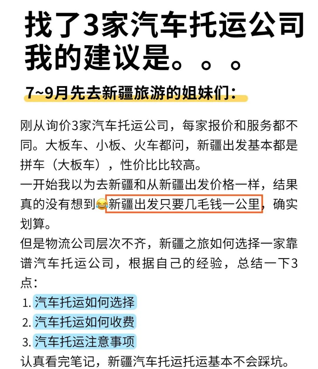 姐妹们!刚从新疆拖车回来,现在想起托运那几天还心有余悸……本以为托运就是打个电话的事,结果咨询了3家公司才发现套路满满!今天含泪整理这份攻略,7-9月准备开新疆的姐妹速速收藏!