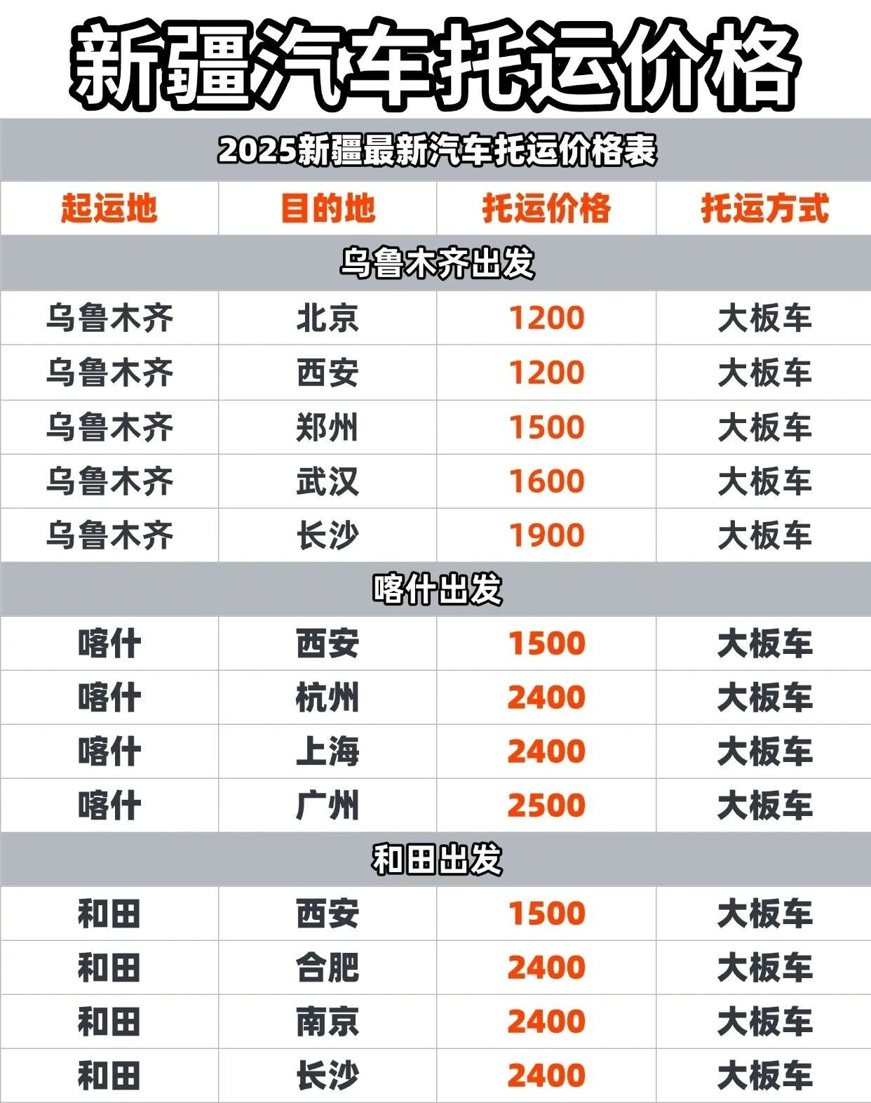 根据运输距离和线路不同而有所差异。一般来说,目的地距离2000公里内约1000 - 2500元;2000 - 3000公里约2500 - 4500元;3000公里以上约4500 - 6500元。例如,乌鲁木齐到西安距离2580公里,汽车托运价格在1100 - 1300元之间;乌鲁木齐到北京距离2817公里,价格在1200 - 1400元之间。车型费