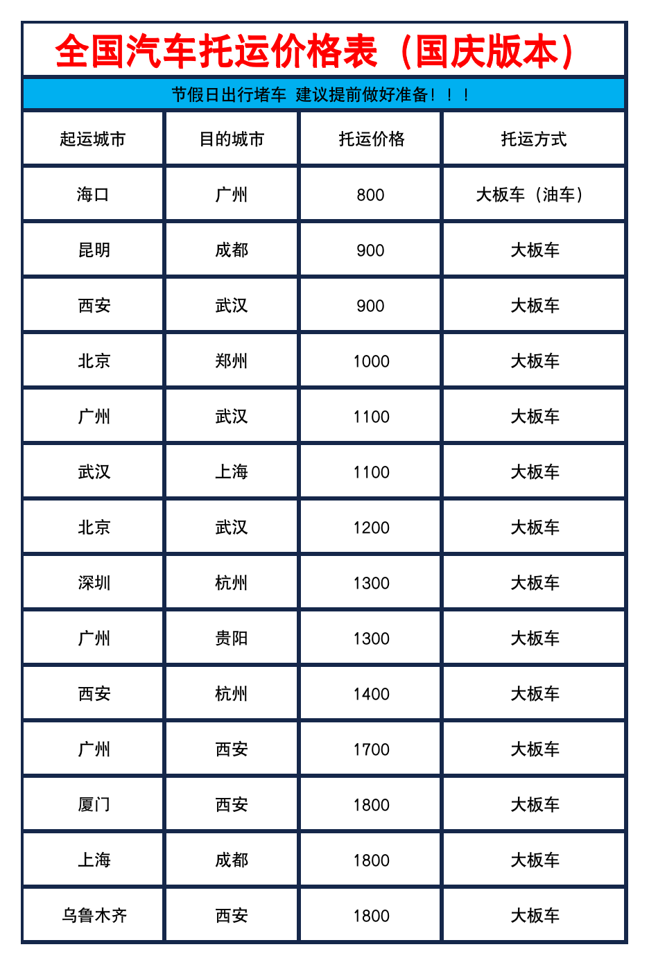 马上迎来国庆黄金周,今年国庆假期出游预订节奏比去年提前约3天,出游热门城市主要集中在北京、广州、杭州、昆明、新疆、海口等地。游玩结束后,若不想跨省开长途,汽车托运或许是你的绝佳选择。
