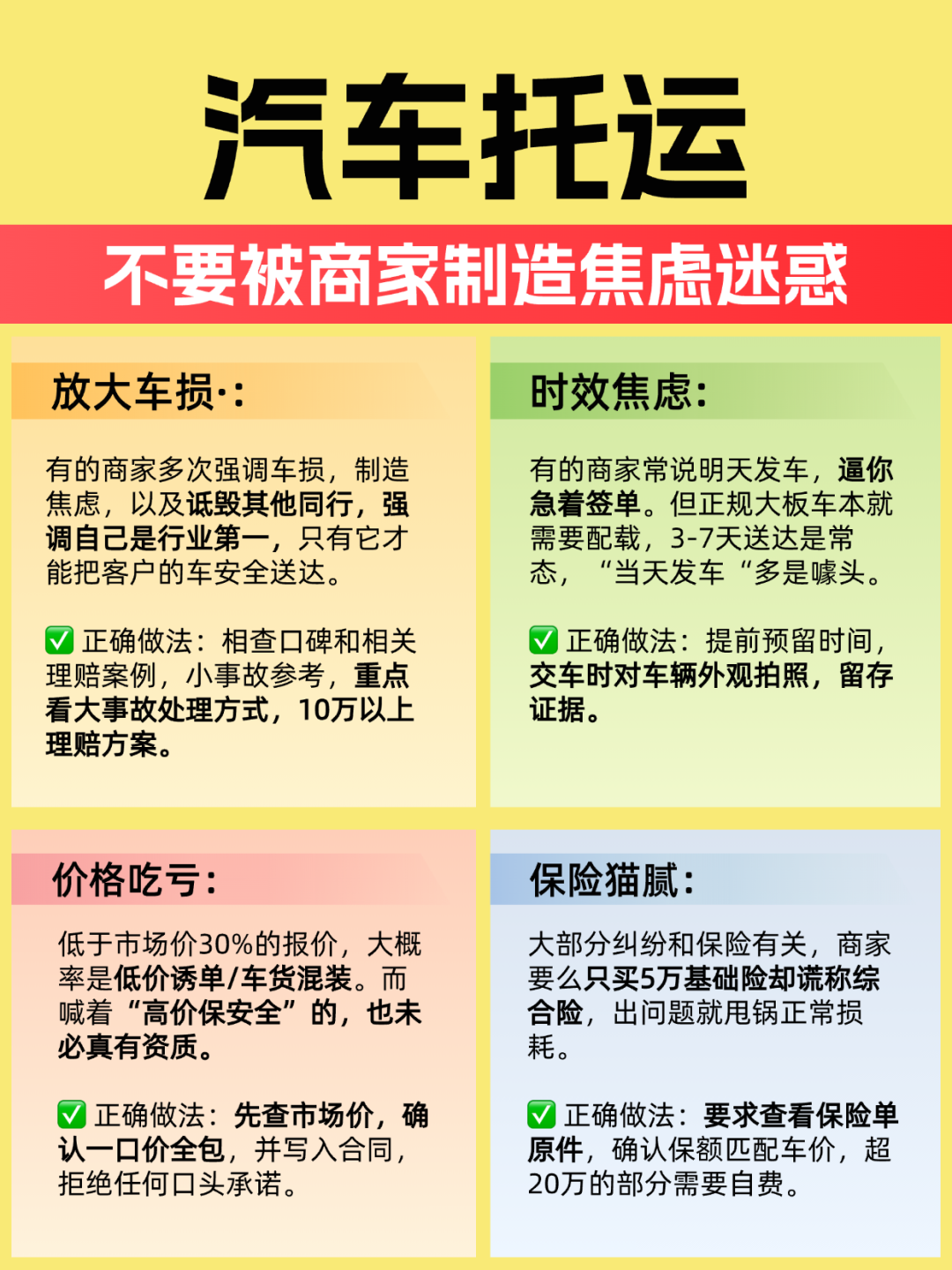 其实汽车托运没那么复杂,核心就是别被商家的焦虑话术牵着走,提前做好功课、守住合同底线。按这些方法避坑,既能保障车辆安全,又能省去一堆麻烦,真正实现省心又安心。