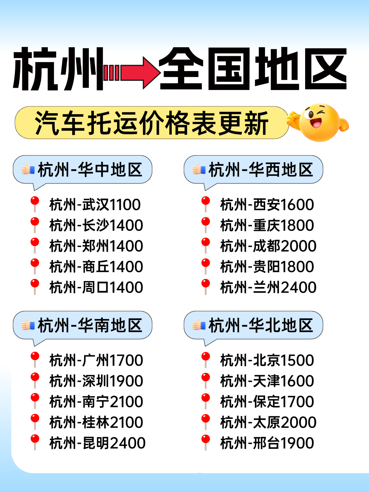 春节返乡的脚步越来越近,后台陆续收到不少杭州车主的咨询,核心都围绕着“从杭州托运汽车回老家要花多少钱”“节前托运会不会踩坑”。刚好整理到一份最新的汽车托运参考报价,覆盖华中、华西、华南、华北四大区域主流返乡城市,特意精简了冗余价格表述,同时补充关键注意事项,帮大家提前做好规划,轻松开启团圆路。