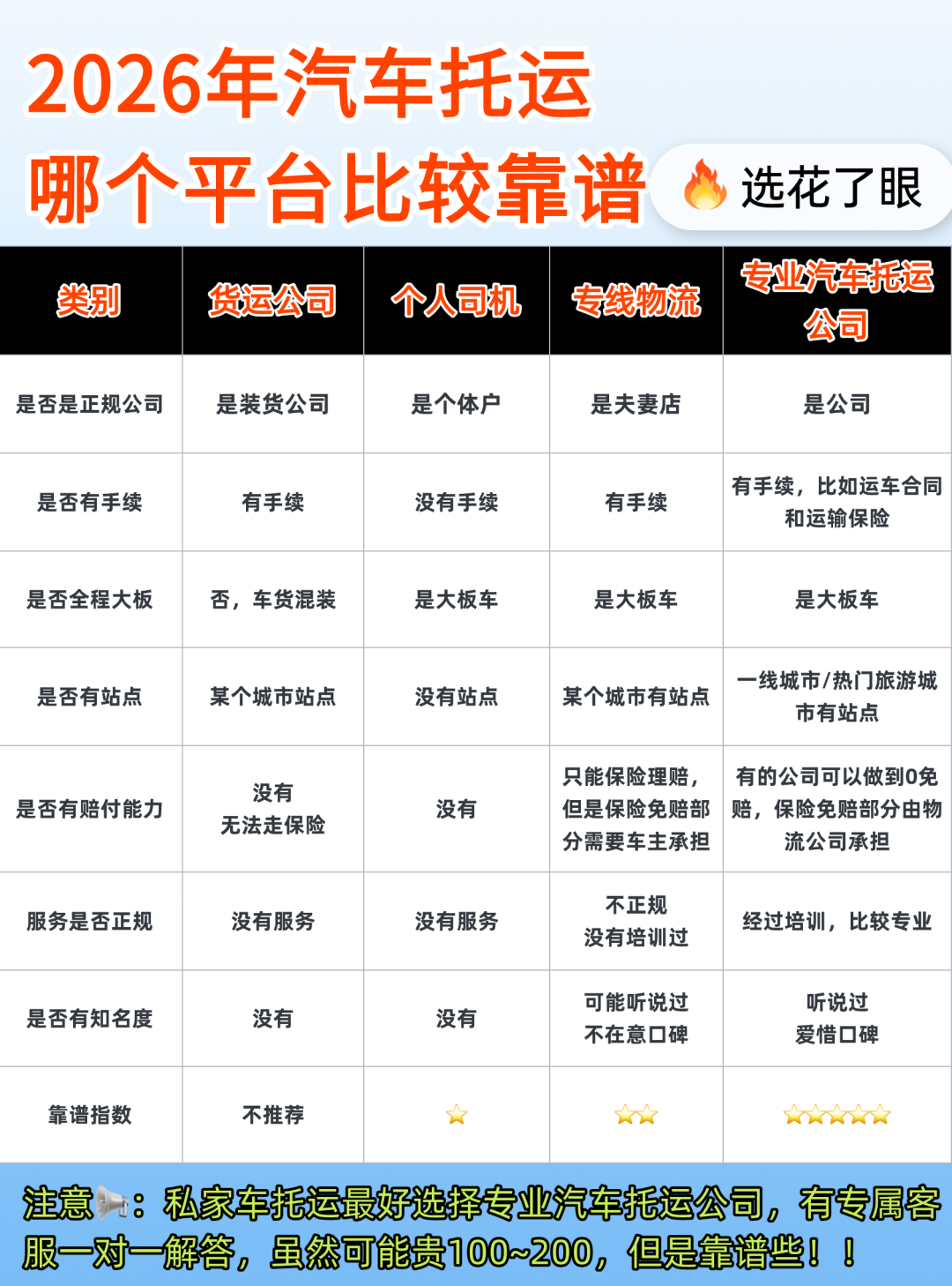 是不是一搜汽车托运,瞬间就被五花八门的平台绕晕了?货运公司、个人司机、专线物流、专业汽车托运公司…不同类型的服务商让人眼花缭乱,到底哪家才靠谱、能真正保障爱车安全?别急,下面这份详细对比指南,中车物流帮你把各类平台的优劣理得明明白白!👇