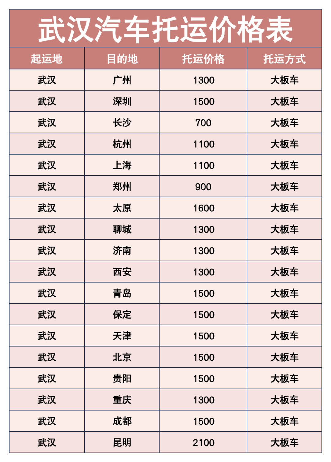 二、武汉汽车托运到全国价格表,提前码住不踩价