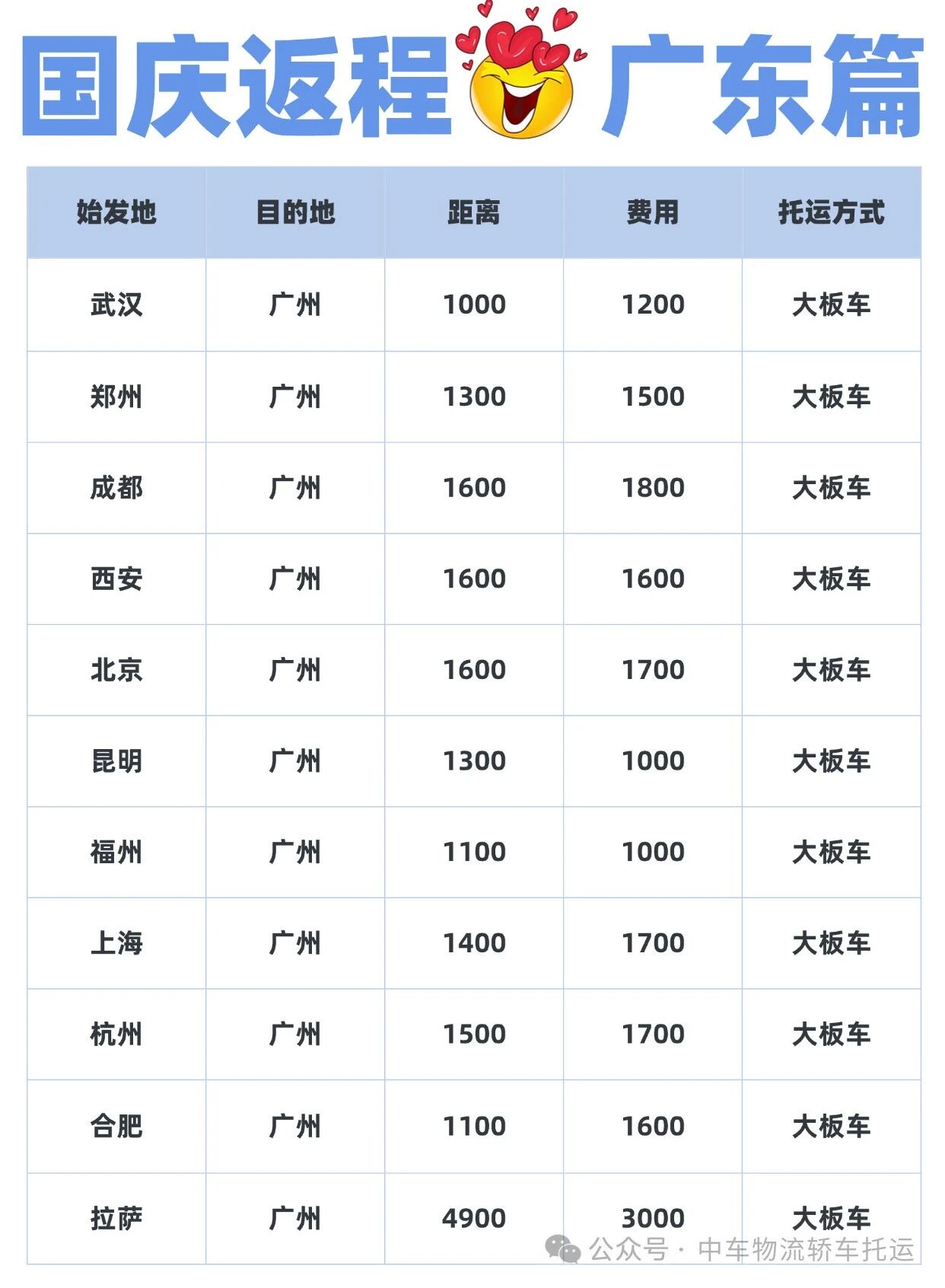 在这个金秋送爽的十一小长假里,相信不少姐妹已经踏上了出游的征途,享受着与家人朋友共度的美好时光。然而,随着假期的逐渐深入,眼看今天已经是3号了,是时候开始规划返程的行程了。为了避免大家堵在高速上,影响返程的心情,中车物流小编特意连夜整理了全国各地到广州的汽车托运费用,希望能为大家提供一些帮助。